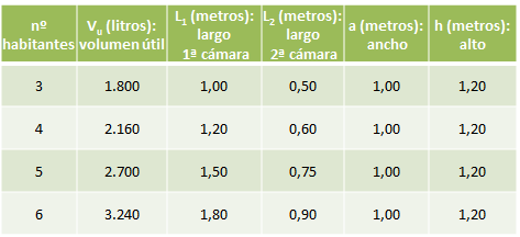El volumen útil total necesario para el adecuado funcionamiento de las fosas se calcula a partir del número máximo de habitantes en la casa.